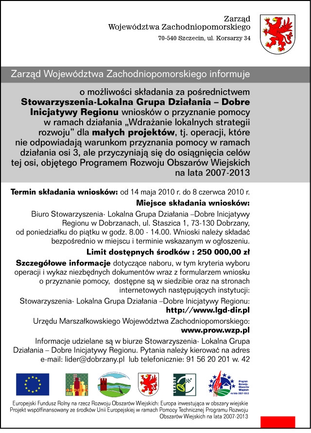 informuje o możliwości składania za pośrednictwem Stowarzyszenia - Lokalna Grupa Działania - Dobre Inicjatywy Regionu wniosków o przyznanie pomocy w ramach działania „Wdrażanie lokalnych strategii rozwoju” dla małych projektów tj. operacji, które nie odpowiadają warunkom przyznania pomocy w ramach działań Osi 3, ale przyczyniają się do osiągnięcia celów tej osi objętego Programem Rozwoju Obszarów Wiejskich na lata 2007-2013.