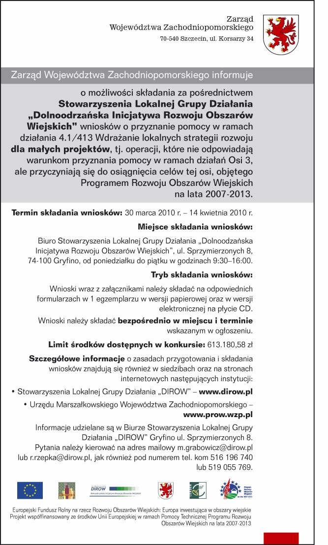informuje o możliwości składania za pośrednictwem wniosków Stowarzyszenia Dolnoodrzańska Inicjatywa Rozwoju Obszarów Wiejskich o przyznanie pomocy w ramach działania „Wdrażanie lokalnych strategii rozwoju” dla małych projektów tj. operacji, które nie odpowiadają warunkom przyznania pomocy w ramach działań Osi 3, ale przyczyniają się do osiągnięcia celów tej osi objętego Programem Rozwoju Obszarów Wiejskich na lata 2007-2013.