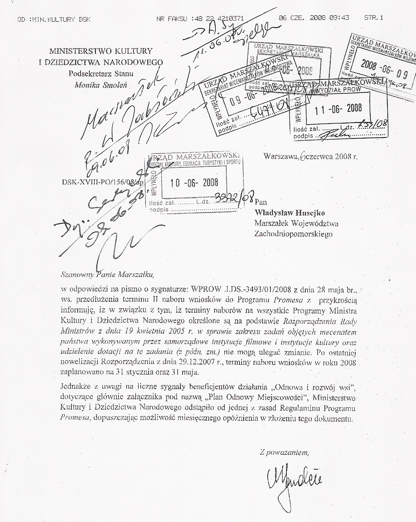 W związku z możliwością otrzymania dofinansowania przez beneficjentów działania ,,Odnowa i rozwój wsi’’ Programu Rozwoju Obszarów Wiejskich na lata 2007 – 2013, z PO „Promesa Ministra Kultury i Dziedzictwa Narodowego”, w dniu 28 maja 2008 r. do Pana Bogdana Zdrojewskiego Ministra Kultury i Dziedzictwa Narodowego zostało przesłane pismo z prośbą o przedłużenie terminu naboru wniosków o przyznanie środków z ww. Programu, którego termin naboru upłynął z dniem 31 maja 2008 r.