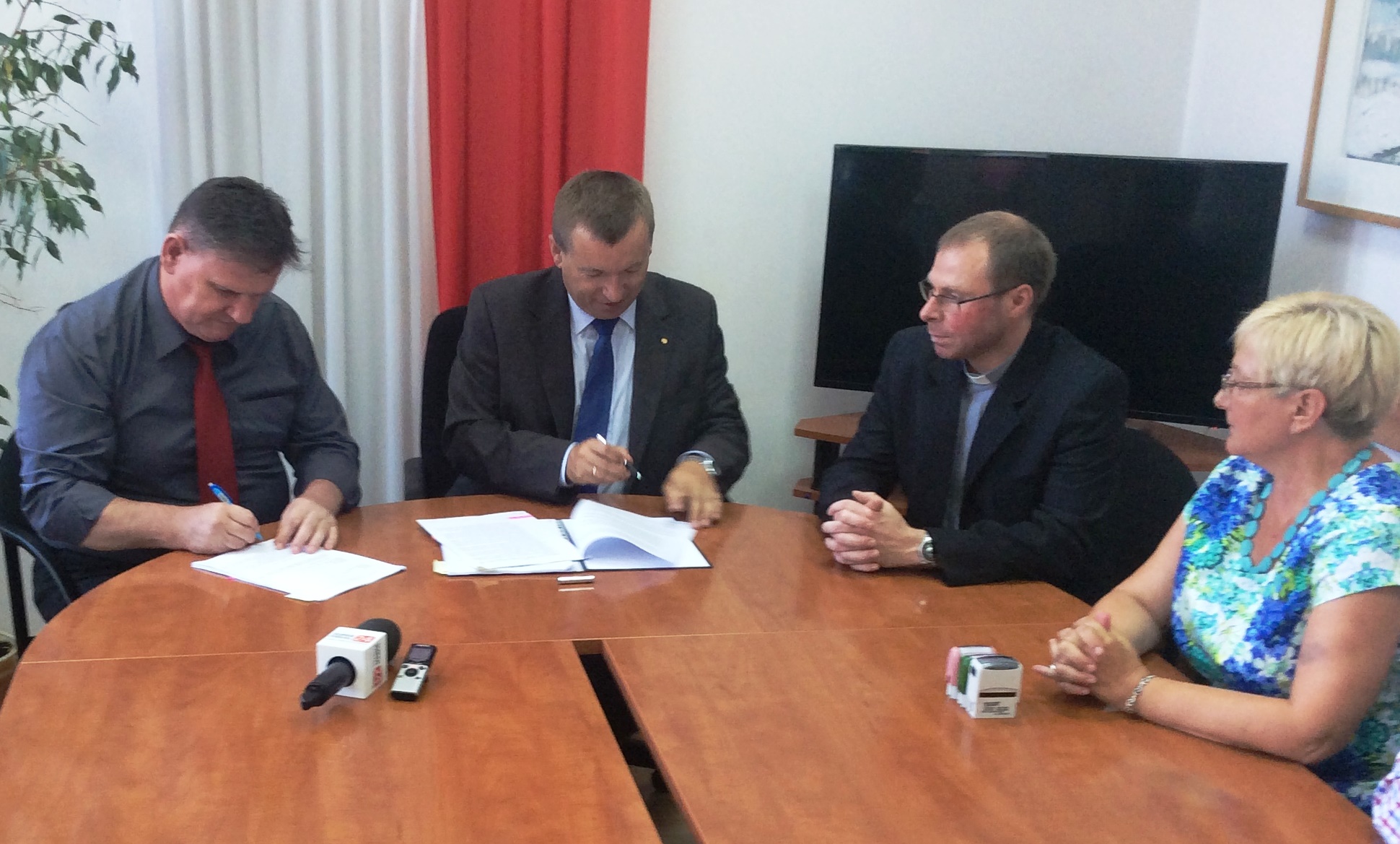 We wtorek, 18 sierpnia 2015 r., wicemarszałek województwa Jarosław Rzepa podpisał umowę umożliwiającą realizację inwestycji w gminie Płoty, która na wykonanie instalacji zdobyła ponad 186 tys. zł. - Pieniądze te pozwolą na zamontowanie paneli fotowoltaicznych w urzędzie miejskim oraz na budynku parafii. Dzięki inwestycjom gmina będzie oszczędzać energię elektryczną - mówi wicemarszałek Rzepa. Wartość całkowita przedsięwzięcia to 280 tys. zł. Ze strony beneficjenta podpis na dokumentach złożył burmistrz gminy Płoty Marian Maliński.