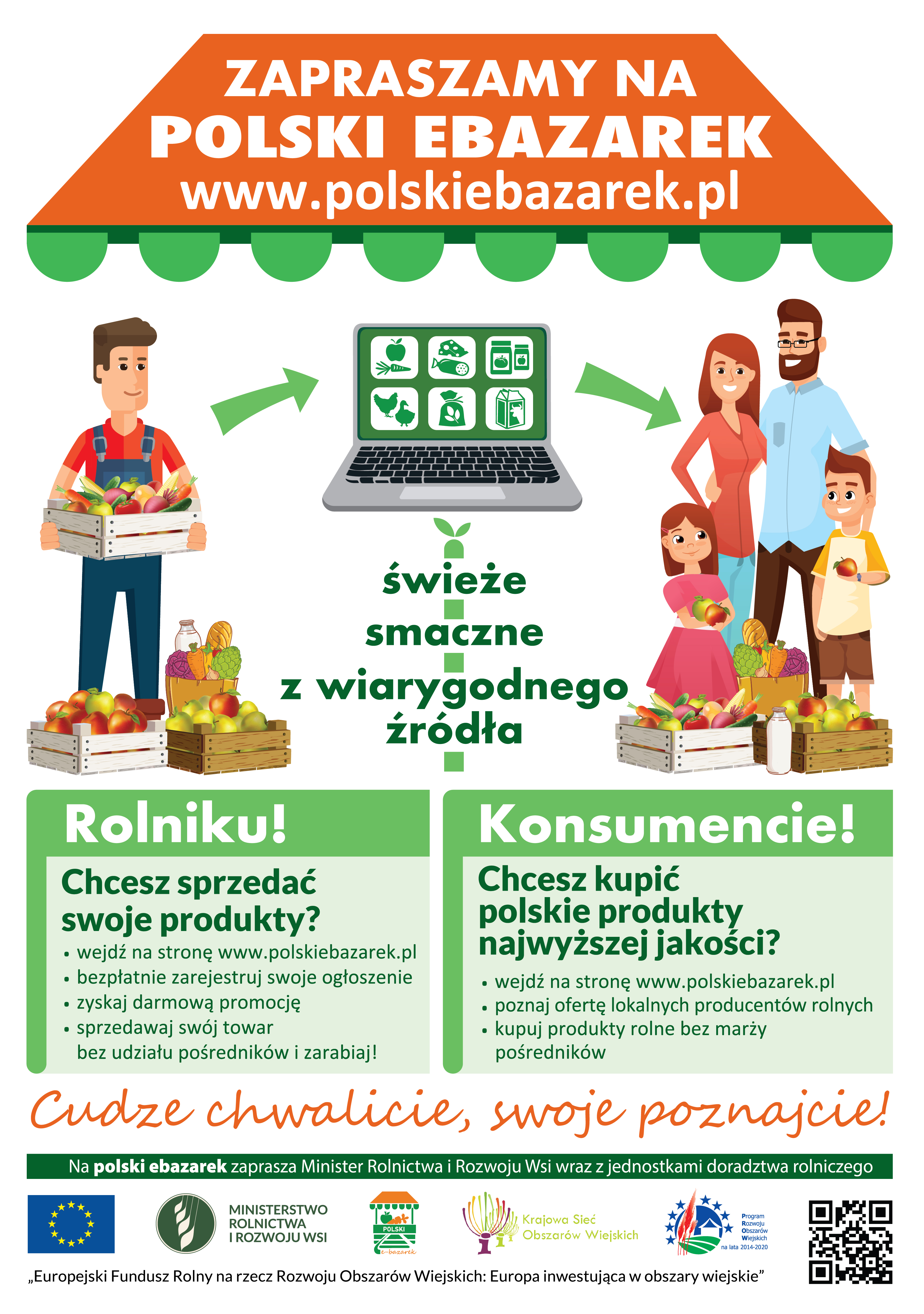 Odwiedź polskiebazarek.pl [1] i zrób zakupy bez marży prosto od rolnika! Oferowane produkty pogrupowane są w grupy towarowe. Na regionalnych stronach ebazarku zaleźć można min. oferty sprzedaży owoców, warzyw, wędlin, przetworów owocowo-warzywnych oraz produkty nabiałowe i zbożowe. Uzupełnieniem są oferty usług rolniczych, sprzedaży zwierząt hodowlanych, a także materiałów siewnych i sadzeniakowych. Ponadto oferty zawierają informacje o sprzedawcy towaru, cenie oraz możliwości wysyłki, dowozu do klienta lub konieczności odbioru osobistego.